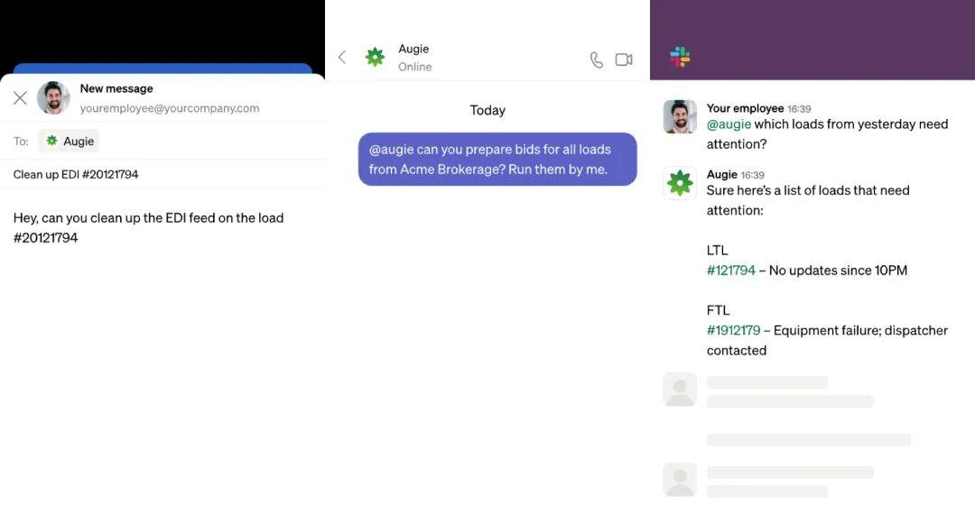 它的核心产品Augie,可以理解为物流行业的AI助理,可以跨系统、跨通信渠道(邮件、电话、聊天、TMS/Portal系统等)来处理那些重复、碎片化、劳动密集型的物流工作。