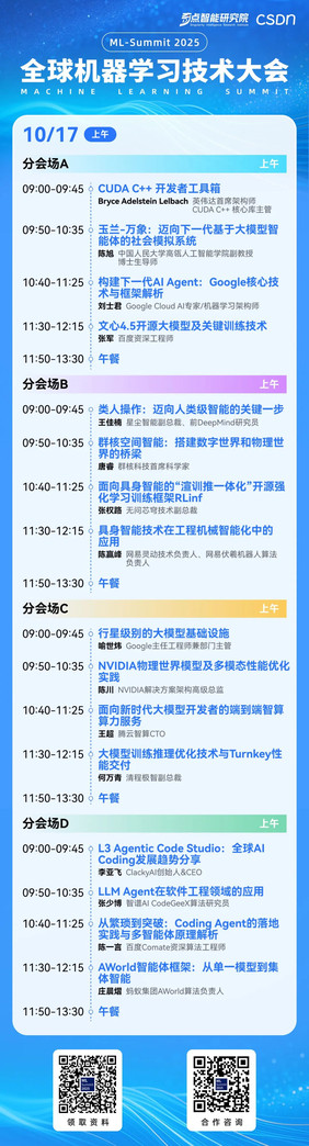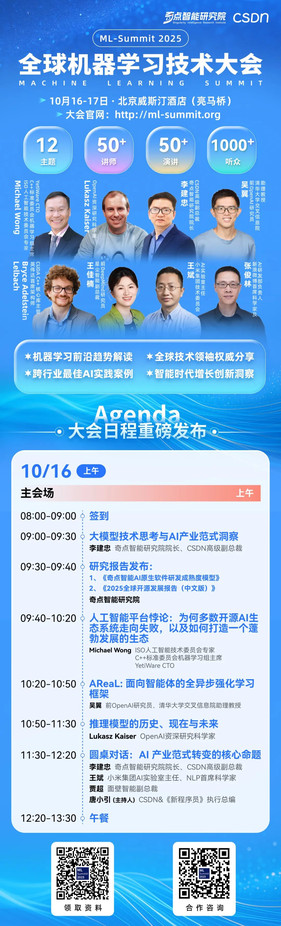 就在本周四,即 10 月 16-17 日,由 CSDN 与奇点智能研究院联合举办的 2025 全球机器学习技术大会将在北京·威斯汀酒店正式召开。