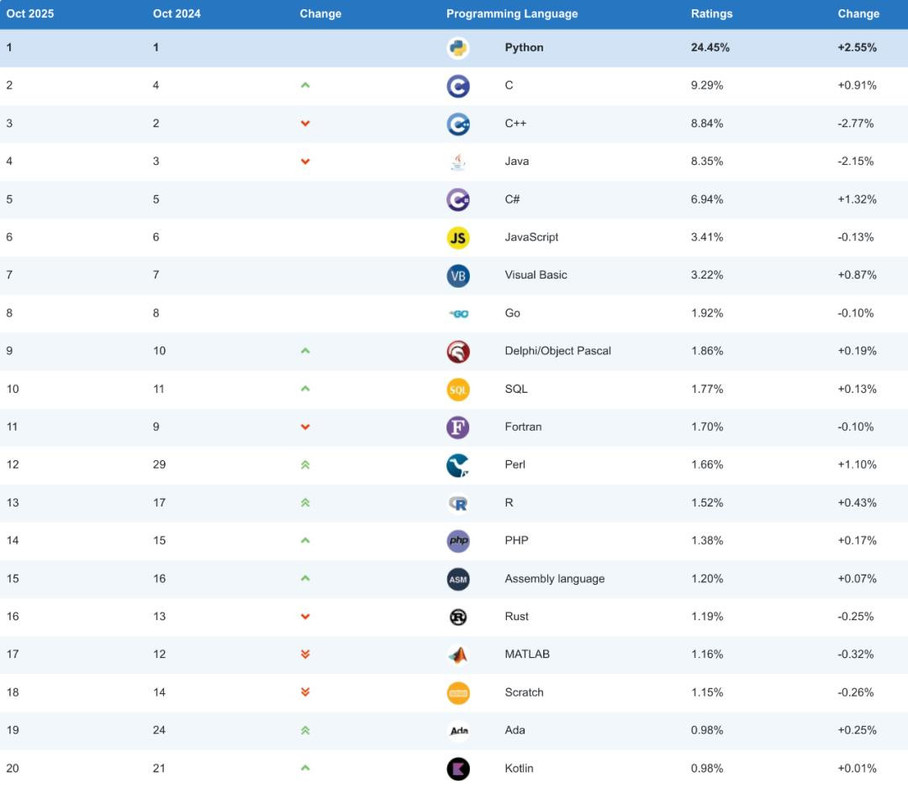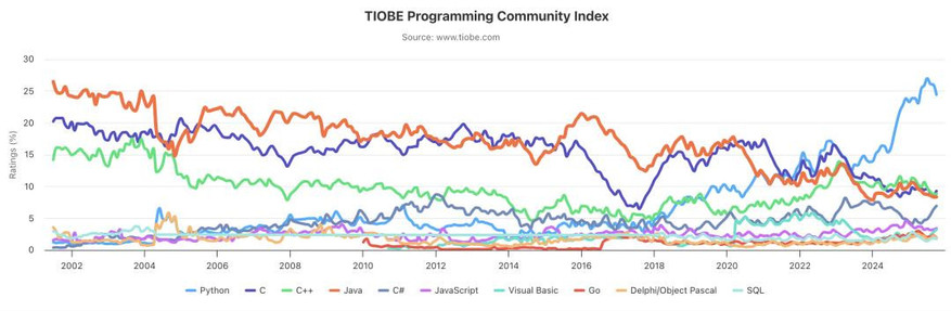 不过,Java 也刚发布了版本 25,C++ 正在筹备 C++26,因此接下来谁能稳住第二名的位置还很难说。三者各有优势:C 简洁高效、速度惊人;C++ 兼具性能与复杂系统支持;而 Java 在大型企业级应用领域依然不可替代。