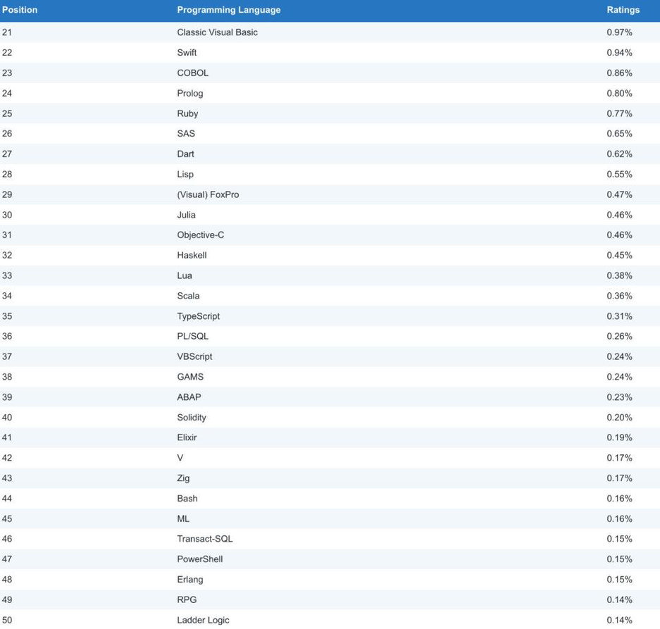 第 51-100 名如下,由于它们之间的数值差异较小,仅以文本形式列出(按字母排序):ActionScript, Algol, Apex, Awk, B4X, Caml, CLIPS, Clojure, D, Elm, F#, Forth, Groovy, Hack, Icon, Inform, Io, J, JScript, LabVIEW, Logo, Modula-2, Mojo, MQL5, NATURAL, Nim, OCaml, Occam, OpenCL, OpenEdge ABL, PL/I, Q, Raku, REXX, S, Scheme, Simulink, Small Basic, Smalltalk, SPARK, Stata, Structured Text, SystemVerilog, Tcl, Vala/Genie, VHDL, Wolfram, X++, XC, Xojo