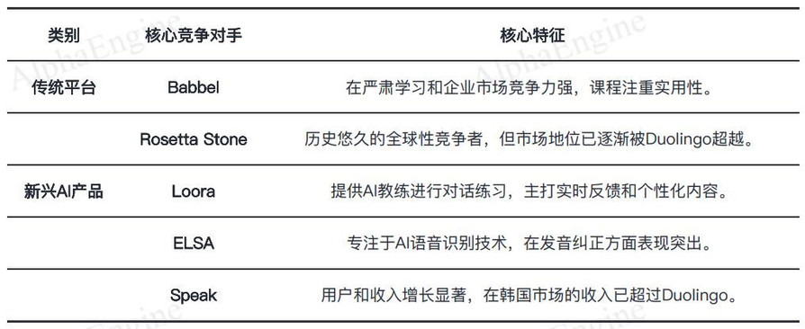 尽管全球语言学习市场格局分散,但 Duolingo 与 Rosetta Stone 、 Babbel 共同构成行业三大主流品牌。其主要竞争对手特点如下: