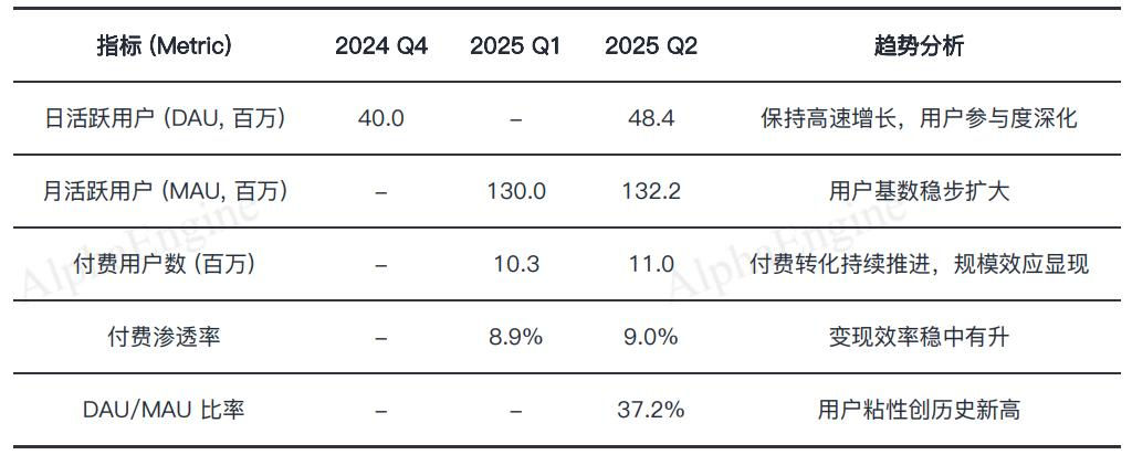用户粘性显著提升 :DAU的增长速度持续快于MAU,推动DAU/MAU比率在2025年第二季度达到37.2%的历史高点。
