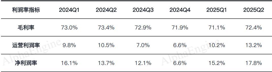 调整后EBITDA利润率是衡量其核心盈利能力的关键指标,该指标在2024年Q2达到27.0%的阶段性高点,并在2025年Q2于持续高研发投入的背景下,仍维持在25.4%的健康水平。