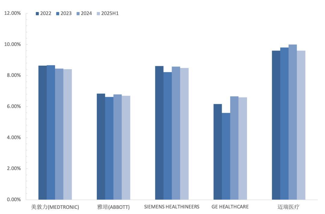 在研发方面,迈瑞保持了较高的研发强度,长期的研发费用率在9~10%区间。而且,长期的研发费用同比增速与收入增长相匹配;即便2025上半年的研发费用出现了一定的同比下滑,但下滑程度远低于收入端,研发费用率因此依然保持稳定。