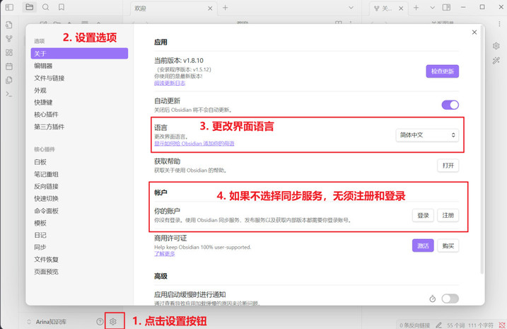 安装完成后,进行一些基础设置能让 Obsidian 更符合你的使用习惯,提升后续体验。