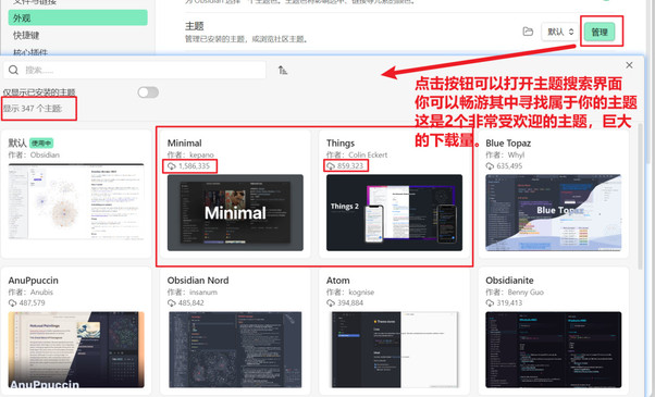 Obsidian 拥有一个非常活跃的社区,贡献了大量精美且功能丰富的主题。当你对基础功能熟悉后,可以点击“主题”下方的“管理 (Manage)”按钮,浏览并安装社区主题,进一步个性化你的 Obsidian。