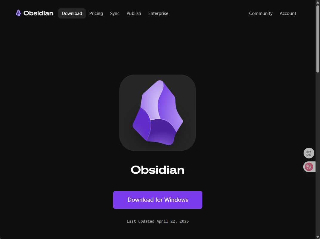 Obsidian 支持 Windows、macOS 和 Linux 主流操作系统。网站会自动检测你的操作系统,并推荐相应的下载版本。点击下载按钮,获取最新版的安装程序。