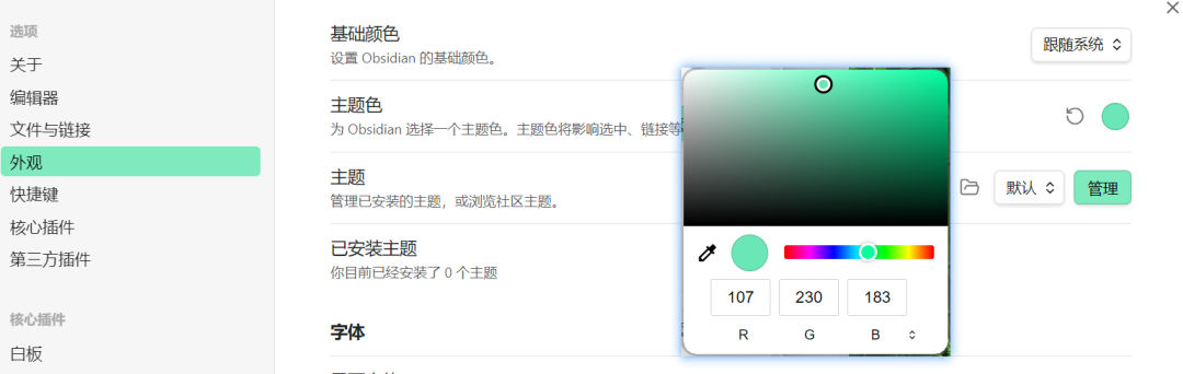 你还可以为Obsidin 选择不同的主题色,例如“蓝色”、“绿色”、“紫色”等等。切换主题色可以让你的笔记界面更符合你的审美。
