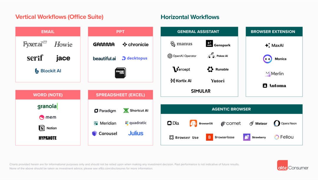 1. 1.差异化的模式已经很明显。垂直产品通过设计和工作流程的精细化脱颖而出——专注于工作“表面”或画布,并深度嵌入专业工作流程。这使得它们在外部使用场景中尤其强大,因为这些场景中精细化和展示至关重要。相比之下,横向产品强调广度:它们通过叠加相关任务来竞争成为“全能型”入口。例如,Manus 已经涵盖了研究、演示和电子表格,定位为工作开始的单一地点