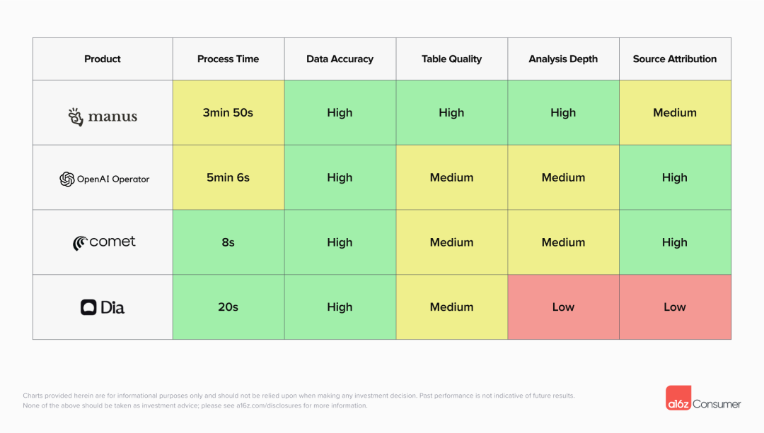 Comet 和 Dia,这两款 AI 原生浏览器,是最快的。它们在 20 秒内返回结果,但与 Manus 相比,它们的输出分析较少且结构不够严谨,而 Manus 提供了更全面的表格和对数字背后驱动因素的更深入解释。