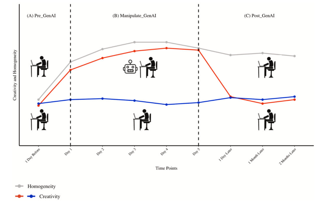 创造力的提升是短暂、不可持续的:在使用AI的阶段(第2-6天),“AI实验组”的各项创造力指标确实远超“纯脑力组”。然而,一旦AI被撤走,这种优势便瞬间消失。从第7天开始直到第60天,两组的创造力表现再无显著差异。更令人警醒的是,在第60天的聚合思维测试中,实验组的参与者表现甚至显著差于从未用过AI的对照组,AI带来的,并非可迁移的“能力”,更像是一种无法内化的“幻觉”。