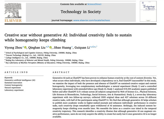 这项纵向追踪研究用直接的因果证据,证实了AI对个人创造力的长期影响。AI带来的可能只是一种无法内化的“创造力幻觉”,而它留下的思想趋同,却可能成为一道难以消除的“创意伤痕”,长期存在于我们的认知与表达习惯之中。