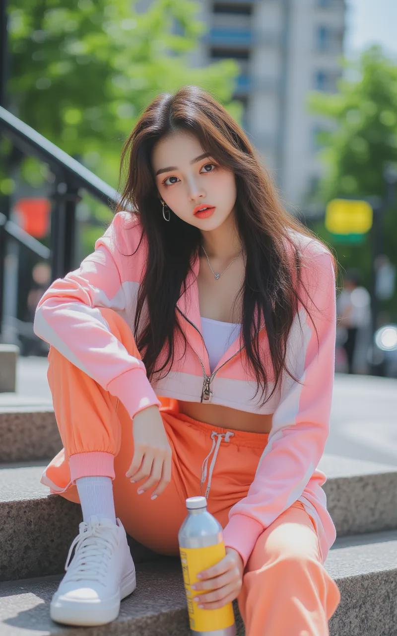 - Prompt:Instagram Filter, Realistic shooting, a super chinese beauty with an easy smile, dressed in a sporty, colorful tracksuit, a bottle of water in hand, as she sits on the steps of a city park, surrounded by the hustle and bustle of urban life