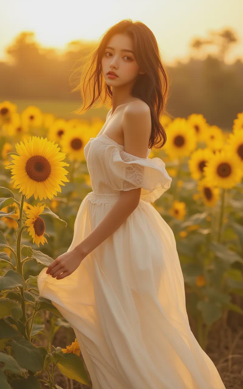 - Prompt:Instagram Filter, Realistic shooting,a super Chinese beauty, adorned in an elegant, flowing white gown, stands amidst a field of sunflowers, her hands gently touching the petals, as the golden sunlight bathes the scene in a warm glow