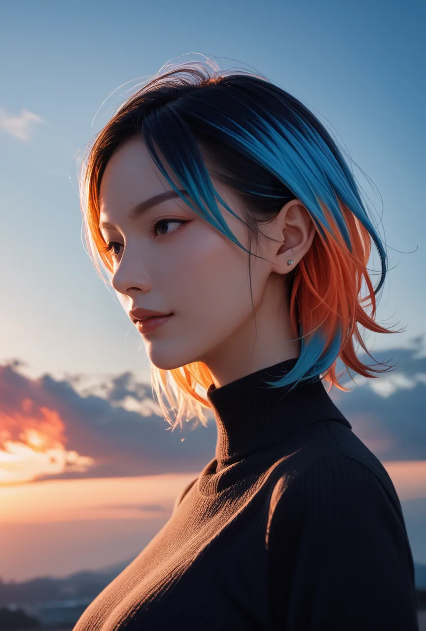 Prompt:score_9, score_8_up, score_7_up, film grain, photo by fuji-proplus-ii film, raw picture of 20 years old girl in black sweater, portrait, colored hair, outdoor, deep blue sky, cloudy sky, fiery clouds,high key light, soft shadow