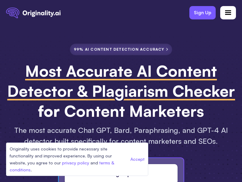 Originality.ai 是一款面向专业人士和机构的专业 AI 内容检测工具,具有高达 99% 的检测精确度,非常适合需要高度原创性内容的网络内容生产者、营销机构、小说作者、教育工作者等群体使用。Originality.ai 不仅能为用户提供高精度的的检测,还能为用户提供写作建议,整体上提高创作的质量,把控作品的原创性及可读性。