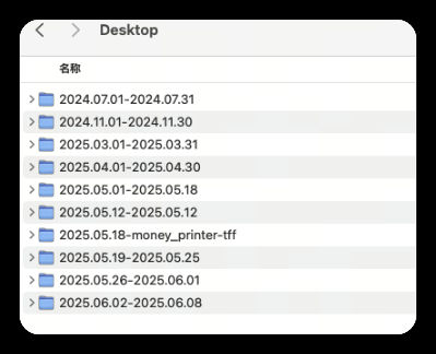 帮我在桌面按周创建文件夹,如2025.05.19-2025.05.25,一直从5月19日创建到现在,然后将桌面对应创建时间的文件移到对应文件夹里面去