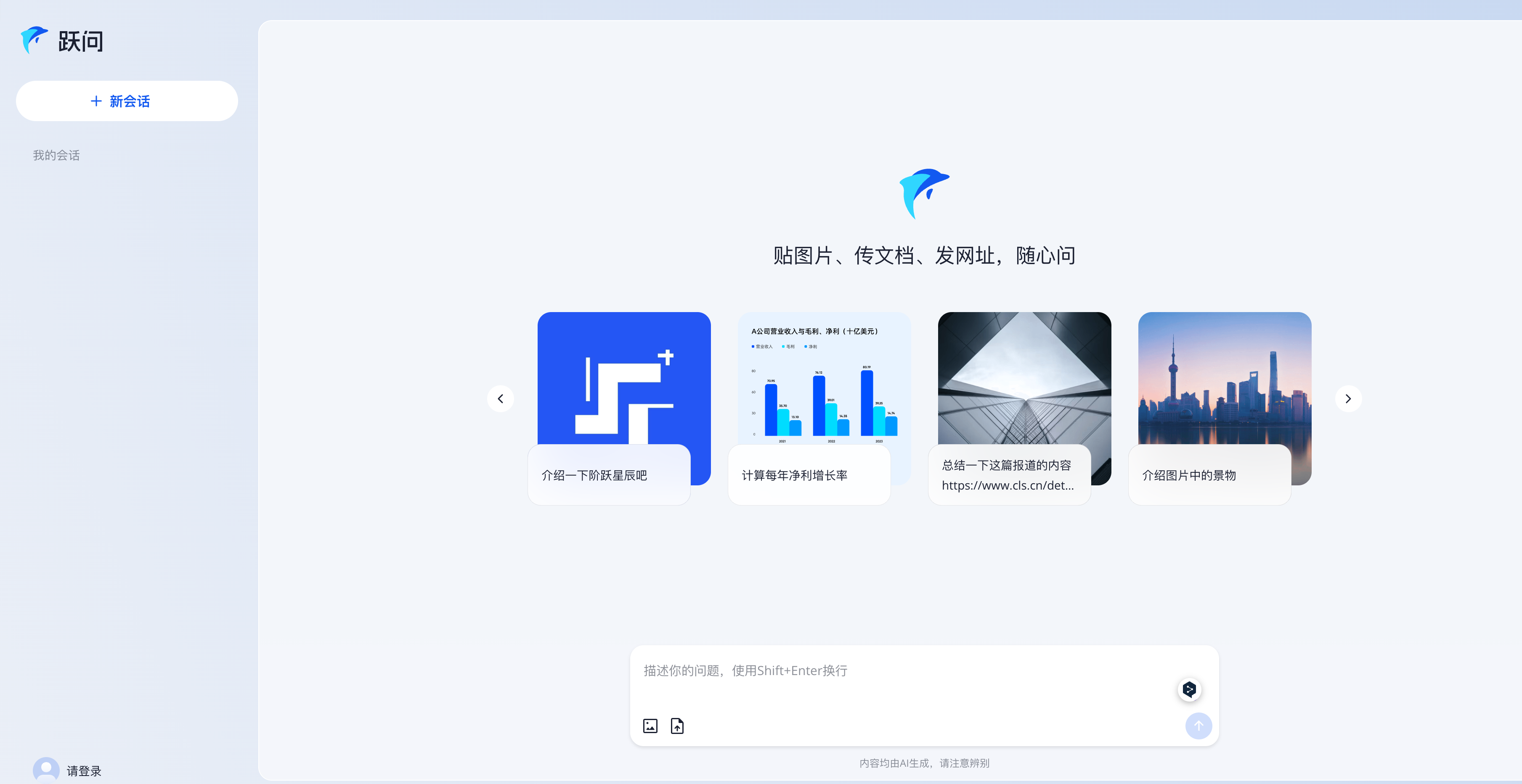 使用跃问时,你可以直接向它提问,或者上传图片、文档、网页,跃问能自动分析数据,并为你提供准确、专业的解答与有效的帮助。