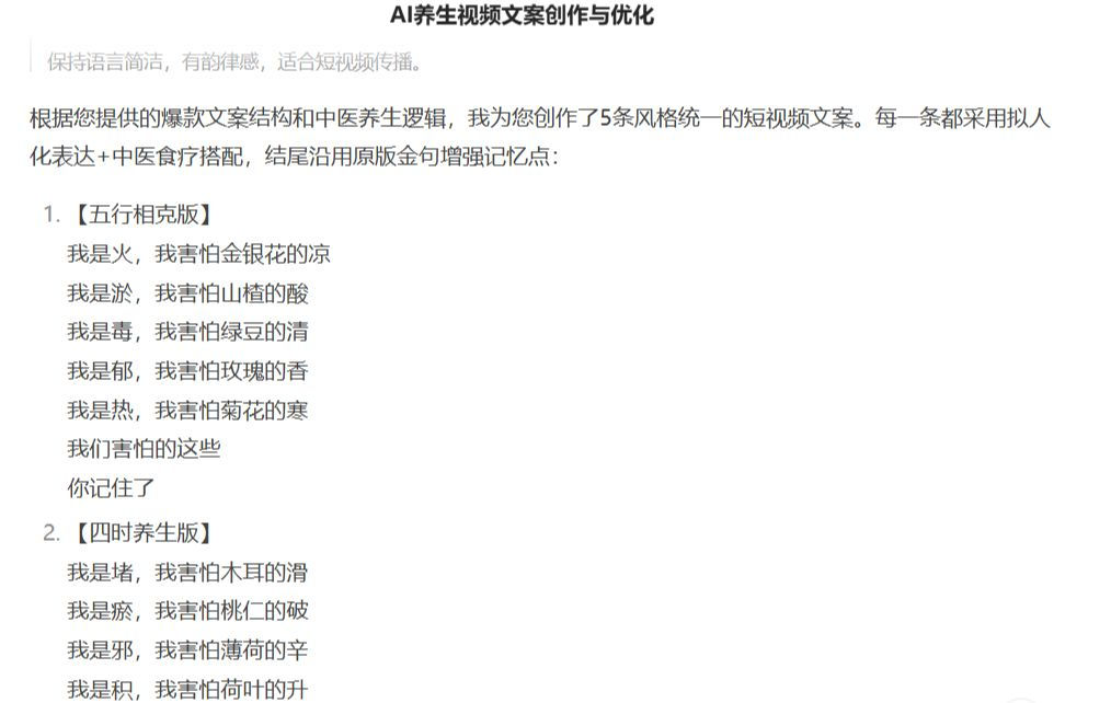 - 输入:我想做一个养生的 AI 视频,请参考我提供的 爆款短视频养生文案,帮我生成 5 条短视频文案