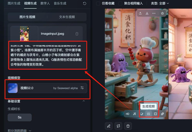 找到我们满意的图片,点击生成视频,页面会调整到图生视频窗口。