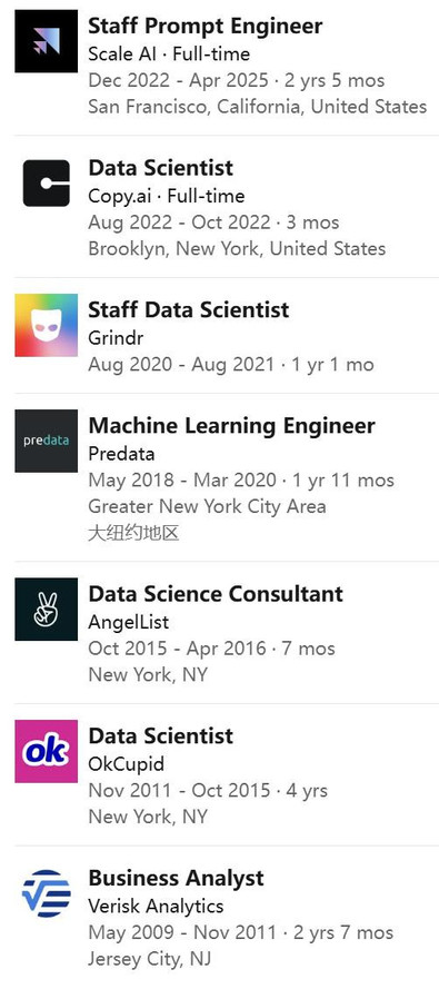 毕业后,他先后加入Verisk Analytics、OkCupid、AngelList任业务分析师、数据科学家、数据科学分析师。
