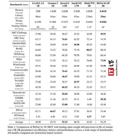 微软测试显示,该模型在 GSM8K(数学)、PIQA(物理常识)等基准测试中表现优异,整体性能媲美主流 1B-2B 参数全精度模型,同时在能耗(每 token 0.028 焦耳)和 CPU 解码延迟(29 毫秒)上占据显著优势。