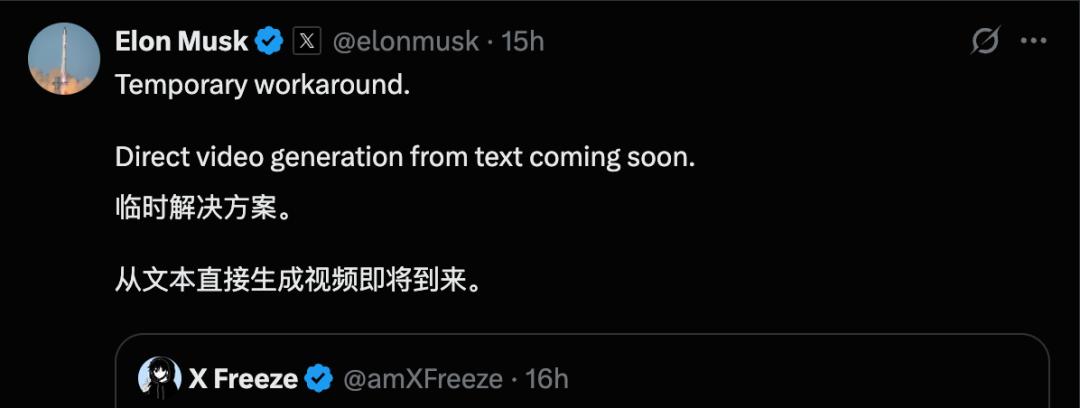 马斯克都转发了这个方案,配文说,「临时的解决方案,但从文本直接生成视频即将到来。」