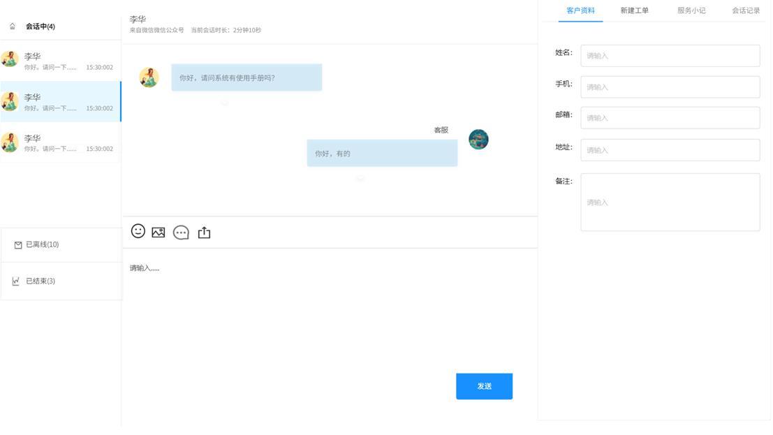 客服工作台是核心业务流程的主界面。可进行一对多服务(一个客服同时接待多个用户),原型页面参考如下: