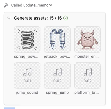此外,和那些以代码生成为主的 AI Coding 工具不同,Gambo 会更加注重游戏资产。它不仅在后台生成逻辑脚本,还会主动整理出项目所需的图片、动画、音效资源,并在界面上单独列出一个「Assets」模块。但很可惜,在资产模块里,用户并不能修改元素,还是需要回到对话框进行修改。