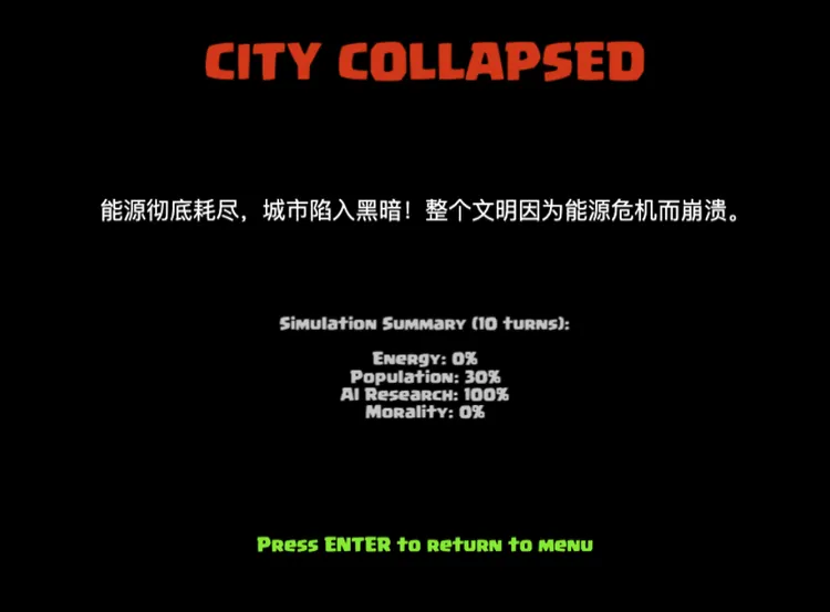 如果说《涂鸦跳跃》测试了 Gambo 的物理引擎,《AI 面试物语》检验了它的文本叙事与分支逻辑,那么《AI City Simulator》则真正挑战了系统复杂度。它不仅要生成 UI 与数值逻辑,还要在此之上组织出有节奏感的动态叙事结构,让 AI 不只是写游戏,而是在模拟一座“被 AI 管理的世界”。