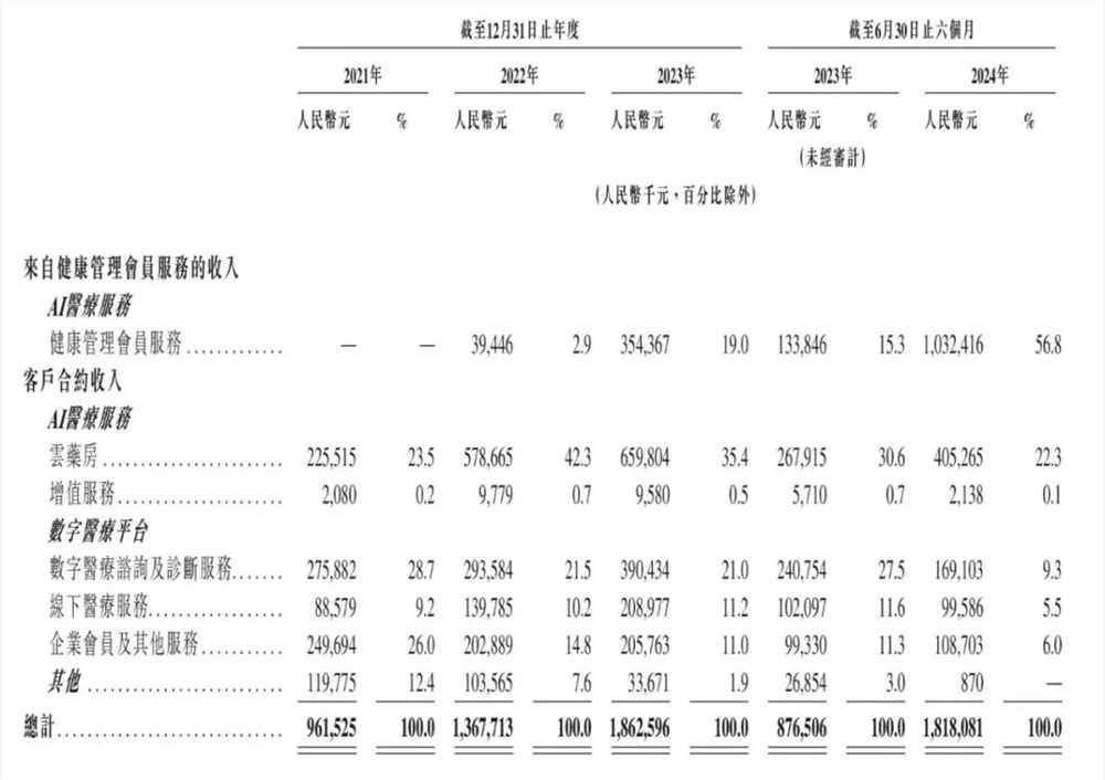 不过当前来看,AI的反哺作用并不明显。在2024年上半年,微医的AI医疗服务的营收达14.4亿元,占总收入的比例跃升至79.2%。不过对利润的贡献度有限。2021年—2023年的毛利率仅为2.6%、1.5%和3.4%,2024年上半年略微上升至4.9%。