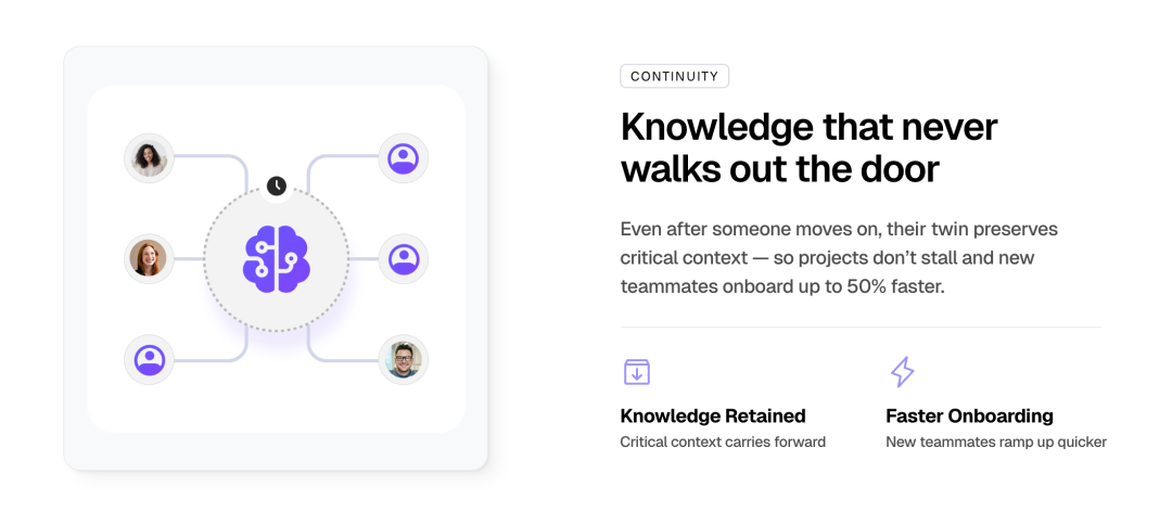 当其他员工需要信息时,他们可以直接向这个人的数字分身提问,就像和真人对话一样。数字分身会基于它学习到的知识给出答案,提供背景信息,甚至解释当初为什么做出某个决策。Ashutosh Garg 在接受 TechCrunch 采访时说:"当每个人都有数字分身时,你可以直接和他们的分身对话,就像在和真人交谈一样,然后得到回应。"