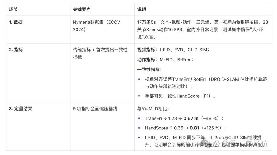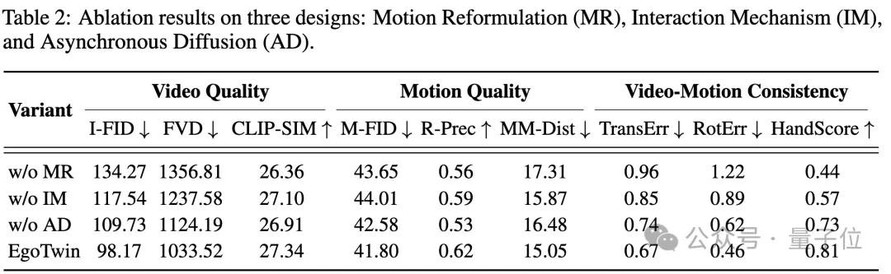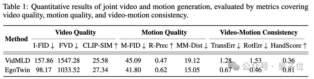 实验证明,EgoTwin比之前的基础模型好很多:视频和动作的匹配度更高,比如镜头和头部的位置误差变小了,手的动作在视频里也更容易对应上;