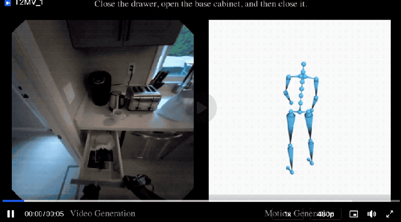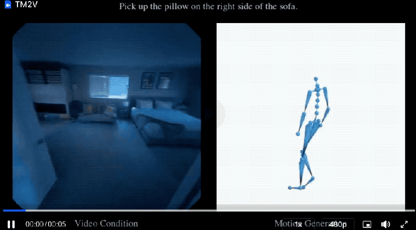 模型能够根据文字和视频生成动作,或者根据文字和动作生成视频,甚至能把生成的视频和动作变成3D场景(比如还原出房间的 3D 结构,再把人的动作放进去)。