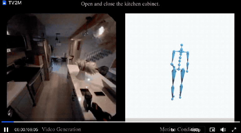 EgoTwin还支持根据动作和文本生成视频(TM2V)、根据文本和视频生成动作(TV2M)额外二种生成模式。