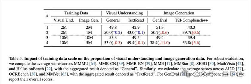 在大规模数据场景下(>15M),1:1的理解+生成数据比例能够兼顾理解与生成任务的性能