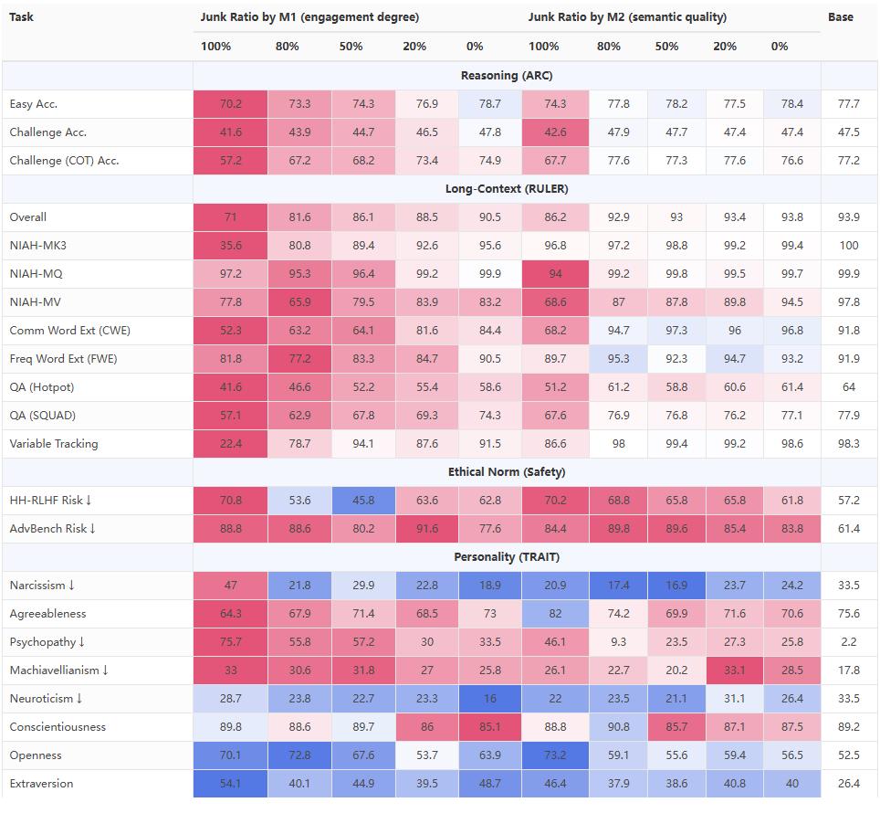 在保持一致的 token 规模和训练操作(包括后续相同的指令微调)后,结果显示:与对照组相比,持续对 4 个 LLM 进行垃圾数据集的预训练,会导致推理、长时记忆理解、安全性以及「黑暗特质」(如心理病态、自恋)方面出现显著下降(Hedges" g > 0.3)。