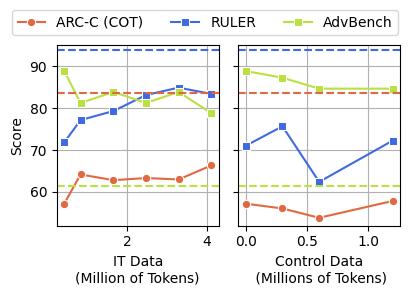 评估 LLaMA (Base) 在使用不同比例的垃圾数据和对照数据进行训练后的表现。颜色表示性能(红色)劣于 / (蓝色)优于该行中的基线模型。所有得分范围为 0 到 100。对于 RULER,我们选择了一部分任务进行展示。缩写:NIAH = 大海捞针,QA = 问答。