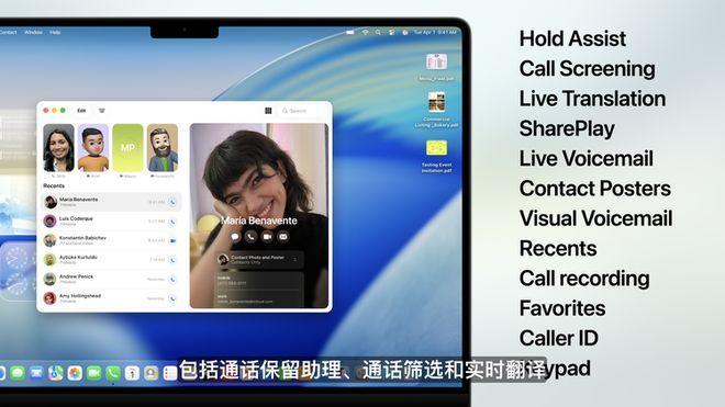 在系统功能上,macOS26加入了电话功能和实时活动显示,用户现在可以在 Mac 上直接通过 iPhone 来拨打电话,前文提到的实时翻译通话、呼叫保持等功能在 MacOS26上也同步支持。