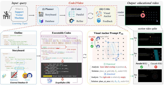 • 鉴赏家(Critic)——利用多模态模型(VLM)反馈与视觉锚点提示(Visual Anchor Prompt)对生成的教学视频进行修正,避免元素遮挡、位置错乱,保证画面层次清晰、讲解可读。