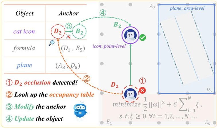 • 为解决自动生成中常见的元素遮挡、位置错乱等空间布局问题,文本提出视觉锚点提示(Visual Anchor Prompt),为关键视觉元素(如公式、图表、文本框)在画面中的相对位置和层次提供了结构化的指导。在生成代码时,自动维护锚点提示表,记录放置对象以及对应锚点坐标;在检查到视频中布局不当时,Critic 会查表并生成具体的新锚点、以及可执行的反馈(如 move to B2)给 Coder 进行迭代修正。