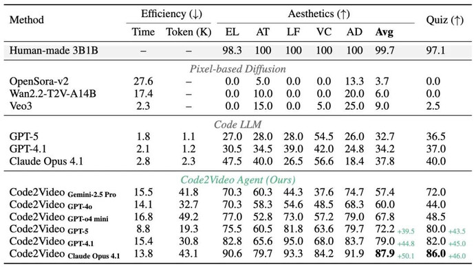 • 代码范式有效:直接使用 Code LLM 生成 Manim 代码并渲染视频的新范式,相比基于像素空间的视频生成方法在 TeachQuiz 指标上平均提升约 30%;