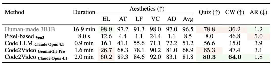 这种多方位的流水线协作设计,使得 Code2Video 能在以下方面发挥优势: