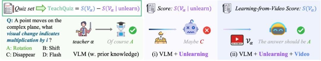 • 知识传递维度(TeachQuiz):如何定量地衡量一个教学视频真正的「教学质量」?传统的视频生成指标(如美学评分)并不足以评估视频的核心目标——知识的有效传递。为此,本文提出了 TeachQuiz,一个旨在直接评测教学效果的全新范式。其核心挑战在于,作为评测者 VLM 模型通常对评测的知识点拥有「先验知识」,这使得衡量「学习增量」变得困难。为解决此问题,我们引入了一种「选择性遗忘(Unlearning 机制)+ 看视频再学习」的评测方法: