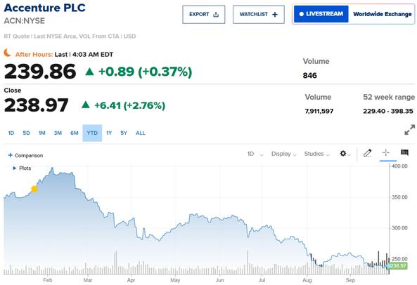 公司2024财年全球营收为649亿美元。今年以来,埃森哲股价已下跌了32%,9月28日收于238.97美元,2月其股价一度达到近400美元。