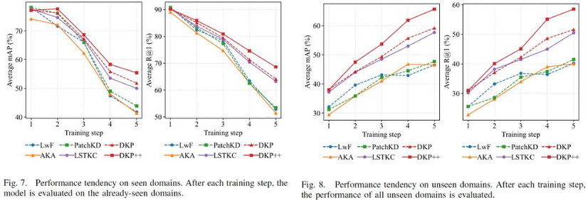 综合性能分析:在两种不同的域顺序设定下,DKP++ 的已知域平均性能(Seen-Avg mAP 和 Seen-Avg R@1)相比于现有方法提升 5.2%-7%。同时,DKP++ 在未知域的整体泛化性能(UnSeen-Avg mAP 和 UnSeen-Avg R@1)上相比于现有方法提升 4.5%-7.7%。