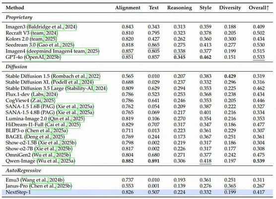 除了直观的视觉效果,阶跃星辰团队也在多个行业公认的 Benchmark 上对 NextStep-1 进行了严格的评估。结果表明,
