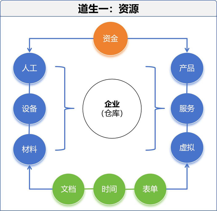 企业资源我们可以分为原有和附带两种,原有就是企业进和出的,进的就是企业买的人机料等,而出的就是企业卖的产品和服务等,进和出的我们都统称为资源。我们对资源的划分是依据约定俗成来的,比如人机料产品服务等,但为什么会区分他们呢,主要就是它们的计量方式不同,比如服务是计次的,产品是计量的,人工是计时的等,有了计量我们才能计算。附带的是什么呢,附带的就是文件和表单等,比如有的产品有说明书,就是一个文档,有的产品有参数表,就是一个表单,有的服务需要按次计时间,那时间也是伴生和附带的。