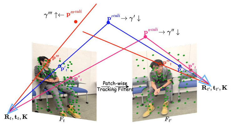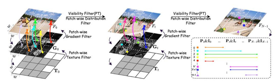 他们发现现有方法都依赖预训练的密集预测模型(深度,光流,点跟踪)建立帧间联系作为伪监督。但这种密集预测模型经常由于准确性无法保证而引入噪声伪监督,影响模型损失回归。但是,准确且鲁棒的帧间关系的建立理论上并不需要密集预测,相反,密集预测除了引入噪声外还会增加模型处理数据的负担,降低模型优化效率。因此,他们提出补丁式跟踪滤波器,用来高效,准确的建立视频帧之间的铰链式稀疏点跟踪联系。
