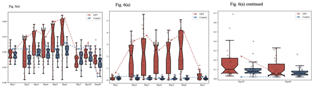 创造力的提升是短暂、不可持续的:在使用AI的阶段(第2-6天),“AI实验组”的各项创造力指标确实远超“纯脑力组”。然而,一旦AI被撤走,这种优势便瞬间消失。从第7天开始直到第60天,两组的创造力表现再无显著差异。更令人警醒的是,在第60天的聚合思维测试中,实验组的参与者表现甚至显著差于从未用过AI的对照组,AI带来的,并非可迁移的“能力”,更像是一种无法内化的“幻觉”。